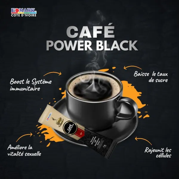 Café Power Black Ingrédients clés Poudre de caféCafé en poudre Microground Extrait de Ganoderma Une tasse de café Power Black aide à: Réduire le taux de sucre dans le sang Booster le système Immunitaire Oxygéner le corps – Rajeunir les cellules Améliorer la vitalité sexuelle Promouvoir le bon sommeil. COMMANDER